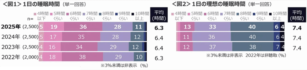 2025年の調査では、平均睡眠時間は 6.3時間
