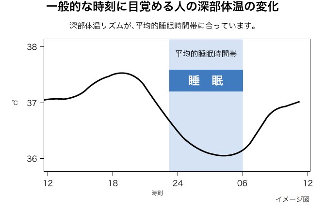 そこから起床に向けて体温は上昇し、目覚める頃には 37度近く まで上がっていきます。